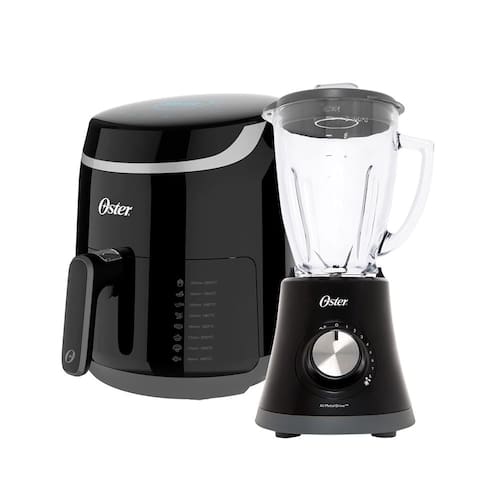 Kit Oster contendo uma Fritadeira Black Digital Fryer 3,2L com painel touch e um Liquidificador Super Chef Preto 1,25L com motor de 750W e 8 velocidades.