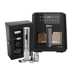 Kit Oster com Fritadeira Digital Clear (4,6L, visor transparente, 8 funções pré-programadas, timer de 60 minutos, grelha Easy Clean) e Kit Vinho Inspire (abridor elétrico, cortador de lacres, anel anti-gotas, bomba a vácuo).Porta-fio