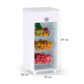 A fruteira de chão e o balcão para galão de água apresentam as mesmas dimensões — 87 cm de altura, 35 cm de largura e 38 cm de profundidade — e são produzidos em MDP com pintura UV, oferecendo praticidade e organização para a cozinha. A fruteira conta com três cestos em grade de ferro, uma gaveta com corrediças telescópicas de fácil deslizamento e um puxador ergonômico, sendo ideal para armazenar frutas de forma acessível e ventilada. Já o balcão é equipado com uma porta com dobradiças metálicas, uma gaveta com corrediça metálica e uma prateleira interna, proporcionando espaço funcional para acomodar filtro ou galão de água, mantendo o ambiente organizado.