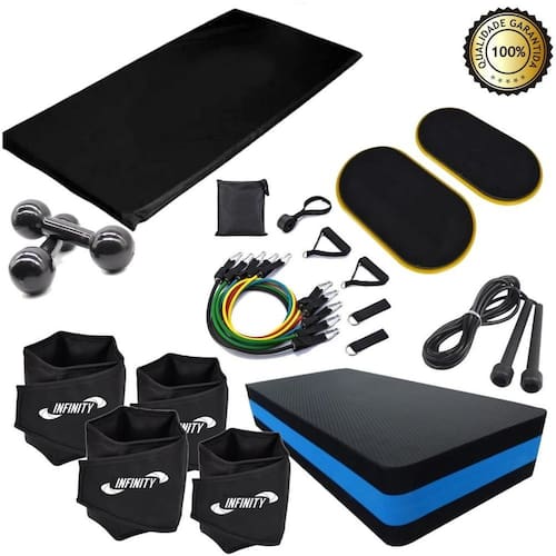 Kit funcional step+ colchonete +caneleira de 2 e 4 kg + halteres de 2 kg+ corda + kit 5 vias + slide de deslizamento Kit funcional composto por: - step em eva 60x28x10 cm - colchonete em espuma 90x45x2cm - par de caneleira 2 kg - par de caneleira 4 kg - par de halter emborrachado 2 kg - corda de pular em pvc - kit elástico 5 vias - disco d deslizamento Ean: 7890018707663