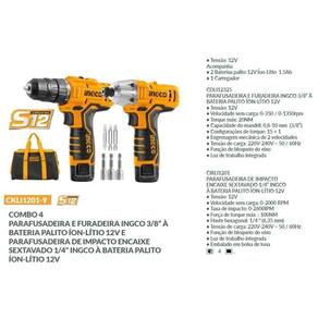Combo 4parafusadeira e furadeira ingco 3/8 àbateria palito íon-lítio 12v eparafusadeira de impacto encaixesextavado 1/4 ingco à bateria palito íon-lítio 12v Tensão: 12vacompanha 2 baterias palito 12v íon-lítio 1.5ah 1 carregador Bolsa + soquete + bitscdli12325parafusadeira e furadeira ingco 3/8 àbateria palito íon-lítio 12v Tensão: 12v Velocidade sem carga: 0-400 / 0-1500rpm Torque máx: 20nm Capacidade do mandril: 0,8-10 mm 3/8 Configurações de torque: 15 + 1 Engrenagem mecânica de 2 velocidades Tensão de carga: 220v-240v 50 / 60hz Função de bloqueio do eixo Luz de trabalho integradacirli1201parafusadeira de impactoencaixe sextavado 1/4 ingcoà bateria palito íon-lítio 12v Tensão: 12v Velocidade sem carga: 0-2000 rpm Taxa de impacto: 0-2600ipm Força de torque máx .: 100nm Haste hexagonal: 1/4 6,35 mm Tensão de carga: 220v-240v 50 / 60hz Função de bloqueio do eixo Luz de trabalho integrada Embalado em bolsa de lona Marca: Não Informado