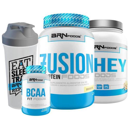 Kit Fusion Protein 900g + Whey Foods 900g + BCAA 100g Tangerina + Coqueteleira 600ml - BRNFOODS Sabor: Baunilha Kit para aumento de Massa Muscular BR Nutrition Foods. A escolha certa para quem busca qualidade e o melhor preçoKit para aumento de Massa Muscular BR Nutrition Foods. A escolha certa para quem busca qualidade e o melhor preçoO que compõe este Kit para aumento de Massa Muscular BR Nutrition Foods:Whey Protein Fusion Protein 900g BRN Foods: 1 unidade de 900gWhey Protein Fusion Protein BRN Foods é elaborada para atender uma variedade de dietas e estilos de vida, é composta por 7 PROTEÍNAS combinadas, cada uma com diferentes perfis de aminoácidos. Sua fórmula garante absorção da proteína por um tempo prolongado e é a solução ideal para as necessidades de proteína de qualquer indivíduo. É uma boa opção para quem quer aumentar a quantidade de proteínas na dieta.Whey Protein Foods 900g BRN Foods: 1 unidade de 900gWhey Protein Foods 900g BRN Foods é um suplemento proteico em pó para atletas formulado com proteína concentrada do soro do leite, conhecida mundialmente como Whey Protein Concentrate. Possui alto valor biológico e alto teor de aminoácidos essenciais.Premium BCAA 120 cápsulas: 1 pote com 120 cápsulasPremium BCAA 120 cápsulas está entre as mais importantes para qualquer programa nutricional esportivo, pois eles são indispensáveis para a manutenção e crescimento dos músculos. É indicado para ser ingerido logo após o treino, pois fornece energia e retarda a fadiga central. Estimula a síntese de proteína muscular recuperando imediatamente os músculos danificados e prevenindo dores.Coqueteleira: 1 coqueteleiraObservação antes do consumo:A Leia atentamente a embalagem com todas as informações do produto, como tabela nutricional, ingredientes e a sua indicação para o consumo.B Kit recomendado para atletas com objetivo de ganho de massa muscular e deve ser consumido sob orientação de um profissional da área.