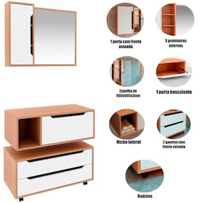 - Profundidade: Gabinete: 38,7 cm/Espelheira: 15,6 cm/Balcão: 38,7 cm