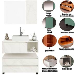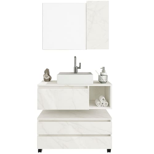 • Material: Gabinete/Balcão e Espelheira: Estrutura em MDP / Cuba: Mármore sintético