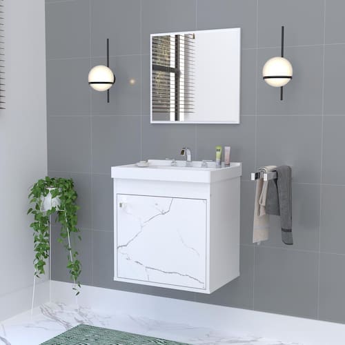 Conjunto gabinete veneto riverzza O gabinete suspenso para banheiro é desenvolvido com estrutura em mdf e a cuba em bmc, garantindo mais durabilidade e resistência ao produto. Medida do gabinete: l x a x c 40cm x 41cm x 31,5cm Peso gabinete: 8,4 kg Peso suportado: 10 kg Medida da cuba: l x a x c 40cm x 2,5cm x 31,5cm Medida da espelheira: l x a x c 38cm x 36cm x 1,5cm Furo da torneira: 2,7cm Furo do ralo/válvula: 3,2cm Medida da embalagem produto desmontado : l x a x c 38,3cm x 21,2cm x 46cm Peso da embalagem: 8,85 kg Itens inclusos: 1 gabinete de banheiro, 1 pia, 1 espelheira e 1 kit de montagem. Acompanha cuba: sim cor: branca Material da cuba: bmc Estilo: moderno Furação para cuba e torneira: sim Material da porta: mdf Material do puxador da porta: plástico Material principal: mdf Possui espelho: sim Possui gabinete: sim Possui gaveta: não Possui iluminação: não Possui pés: não Possui portas: 01 Possui prateleiras: não Possui rodízio: não Kit montagem: sim apenas para montagem, não acompanha parafusos para fixação Necessita montagem: sim Complexidade da montagem: baixa pode ser montado por uma pessoa sozinha Origem do produto: nacional do fornecedor: 03 meses Recomendações de uso, manutenção e limpeza: limpar com pano levemente umedecido Tipo de dobradiça da porta: metálica Tipo de porta: bater Tipo de puxador da porta: externo Marca: Não Informado
