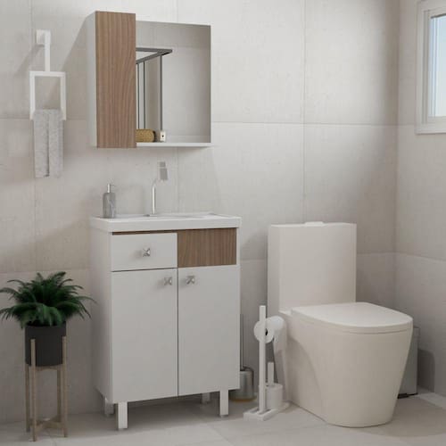 Kit Gabinete 60cm de MDF/MDP composto por duas portas, uma gaveta e cuba de marmorite. Acompanha espelheira. Esse modelo de gabinete de banheiro é perfeito pra quem procura custo benefício sem perder a qualidade do produto. É necessário fazer a montagem da espelheira e dos pés. Acabamento da Cuba: Acetinado Acabamento da Gaveta: Melamínico Acabamento da Porta: Melamínico Acabamento da Prateleira: Melamínico Acompanha Cuba: Sim Acompanha Lâmpada: Não Acompanha Manual de Instalação: Sim Acompanha Parafusos Para Fixação Na Parede: Não Acompanha Tampo: Não Ambiente Principal: Banheiro Complexidade da Montagem: Baixa: pode ser montado por uma pessoa sozinha Cor: Branco/Freijó Cor da Cuba: Branco Cor do Produto: Branco/Freijo Escala de Brilho: Fosco Escala de Brilho da Porta: Fosco Escala de Brilho da Prateleira: Fosco Espessura do Espelho: 3 Formato do Espelho: Retangular Furação para Cuba e Torneira: Sim Gaveta com Chave: Não Itens Inclusos: Gabinete,Cuba, Espelheira e Manual Linha ou Coleção: Vittoria Manual de Montagem e Instalação: https://cdn2.madeiramadeira.com.br/atributo/brasil-slate-company-ltda/1921235-kit-vittoria-60.pdf Material da Cuba: Mármore Sintético Material da Gaveta: MDF/MDP Material da Porta: MDF/MDP Material da Prateleira: MDF/MDP Material do Puxador da Gaveta: Plástico Material do Puxador da Porta: Plástico Material dos Pés: Plástico Material Principal: MDF/MDP Medida da Cuba (C x L x P): 8x35x22 Medida da Espelheira (A x L x P): 55,5x58x16,5 Medida do Gabinete (A x L x P): 87x60x34 Necessita Montagem: Sim Origem do Produto: Nacional Pés Reguláveis: Sim Peso: 30 Peso Máximo por Gaveta: 2 Peso Máximo por Prateleira: 3 Possui Espelheira: Sim Possui Gabinete: Sim Possui Gavetas: 01 Possui iluminação: Não Possui Nichos: Não Possui Pés: 04 Possui Portas: 02 Possui Recorte No Tampo Para Misturador: Não Possui Rodízio: Não Possui Sifão: Não Possui Tampo: Não Produto Montado: Sim Recomendações de Uso, Manutenção e Limpeza: A limpeza deve ser feita somente com flanela ou esponja macia. Sapatas Niveladoras: Não Sistema de Montagem: Somente os pés e espelheira Suporte para Toalheiro: Não Tamanho do Espelho (A x L): 56,5x58 Tipo de Corrediça da Gaveta: Metálica Simples Tipo de Dobradiça/Corrediça da Porta: Com Amortecedor Tipo de Fixação do Espelho: Parafusos Tipo de Gabinete: Gabinete de Chão Tipo de Porta: Abrir Tipo de Puxador da Gaveta: Externo Tipo de Puxador da Porta: Externo Válvula indicada: 40mm