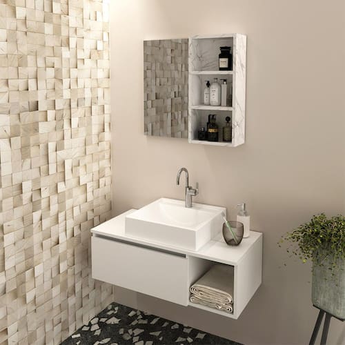 O Kit para Banheiro é a escolha ideal para transformar o seu espaço em um ambiente elegante e organizado. Com um design atual, ele oferece não apenas beleza, mas também funcionalidade, contribuindo para um banheiro agradável e útil. Produzido com materiais de alta qualidade, o kit garante durabilidade e resistência, criando um ambiente harmonioso e agradável para o seu dia a dia. CARACTERÍSTICAS TÉCNICAS: - Produzida em MDP de 15 mm - Acabamento UV na cor Branco e Mármore Branco - Acompanha Espelho - Cuba em Mármore Sintético - Porta Basculante com Dobradiça e Articulador - Balcão Suspenso - Puxador tipo Cava *Kit Composto por Gabinete Suspenso (3601), Espelheira (3609) e Cuba (3630) INFORMAÇÕES TÉCNICAS: 3601: Alt. 26,5 x Larg. 80 x Prof. 38,7 cm P. 10,8 kg 3609: Alt. 54 cm x Larg. 60 cm x Prof. 15,6 x P. 7,65 kg 3630: Alt. 11,5 x Larg. 35 x Prof. 34 cm P. 5,5 kg INFORMAÇÕES ADICIONAIS: - ATENÇÃO: Não trabalhamos e não nos responsabilizamos pela montagem do móvel. Antes da montagem conferir se o produto está de acordo com o que comprou, produto montado e danificado pela montagem não será aceito troca. Montagem e instalação por conta do comprador. - As imagens ambientadas são meramente ilustrativas e podem apresentar itens que não compõe o produto. As cores do produto podem variar de acordo com o monitor, a iluminação do ambiente ou sua percepção visual. - Limpeza: Deve ser feita com pano macio e seco ou levemente. Não devem ser utilizados abrasivos como palha de aço e objetos cortantes. Garantia para defeitos de fabricação conforme Código de Defesa do Consumidor.