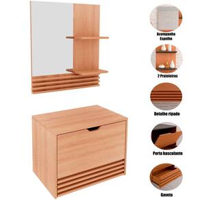 O Kit Gabinete e Espelheira de Banheiro 60 cm Sâmia é a escolha ideal para quem deseja unir estilo e praticidade no ambiente. Com estrutura em mdp de alta qualidade, o gabinete possui acabamento em BP e detalhes em pintura UV, o que garante maior durabilidade e resistência à umidade. Seu design com ripado frontal traz um toque contemporâneo que valoriza qualquer decoração de banheiro.