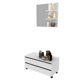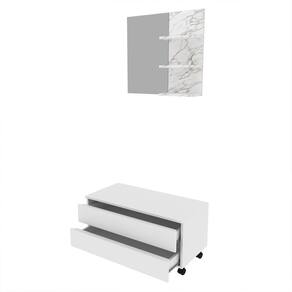 CARACTERÍSTICAS TÉCNICAS: - Produzida em MDP de 15 mm - Acabamento UV na cor Branco e Mármore Branco - Acompanha Espelho - 2 Gavetas com Corrediças Metálicas - Puxador tipo Cava - Balcão com Rodízios *Cuba NÃO incluso, apenas demonstrativo *Kit Composto por Gabinete com Rodízios (3601) e Espelheira (3608)