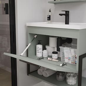 Características: Estrutura em MDF Acabamento em Pintura UV Puxador em alumínio preto fosco 01 Porta basculante com pistão à gás e dobradiças metálicas Suportes laterais em Metalon 20x20 com acabamento em pintura eletrostática preto fosco Acompanha cuba em mármore sintético