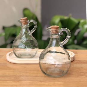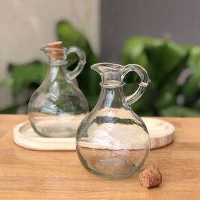 Cor transparenteContém: 2 garrafas com capacidade de 300ml: 1 para azeite e 1 para vinagre e bandeja de pinus para evitar vazamentos sobre a messaOBS: Pode haver leves alterações de formato entre as peças devido aos diferentes lotesEmbalagem contêm 3 peças