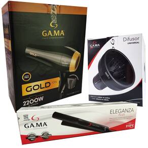 SECADOR DE CABELO GAMA GOLD ION 2200W - 220VMuito mais brilho e reconstrução para o seu cabelo!A grade frontal do secador Gold Ion é feita com a exclusiva tecnologia Essential Oil, ativada com o calor do produto, que nesta versão traz o óleo de Argan, muito conhecido como o ouro líquido entre os profissionais cabeleireiros: é rico em ácidos graxos, ômega 9 e VITAMINA E, sendo assim um antioxidante poderoso, que promove hidratação e nutrição profunda para os fios, combate o envelhecimento e protege dos efeitos negativos do calor.Já a tecnologia Antifrizz que também está presente no secador Gold Ion, é produzida pela alta emissão de íons negativos, responsável por manter a umidade natural dos fios ao mesmo tempo em que fecha a cutícula capilar; resultando em cabelos mais saudáveis, sedosos e com menos frizz.O secador possui motor profissional, para maior desempenho e durabilidade, 2.200W de potência, um fluxo de ar impressionante, 2 velocidades, 6 combinações de temperatura e botão de jato de ar frio.Óleos essenciais, brilho e proteção para todos os cabelos!Grade Frontal Revestida Com Óleo De Argan Para Uma Experiência Única De SecagemInclui Bico Direcionador De ArMotor Ac Profissional - Maior Desempenho E DurabilidadeMais Versatilidade: 2 Velocidades E 6 Combinações De TemperaturasBotão Jato De Ar Frio: Cabelo Com Mais Brilho E Menos FrizzAntifrizz - Seu Cabelo Com Muito Mais Brilho, Maciez E Com Menos Frizz.Óleo De Argan: A Perfeita Combinação De Omega 3 E Outros Ácidos Graxos Para Um Cabelo Hidratado E Nutrido.CHAPINHA PRANCHA ALISADORA GAMA ELEGANZA PLUS CERAMIC ION 210ºC - BIVOLTCom potente resistência de cerâmica, a prancha Eleganza Plus oferece emissão de íons, que selam as cutículas do cabelo, mantendo a umidade natural dos fios, deixando-os muito mais brilhantes e sedosos, longe do temido efeito frizz. Além do mais, seu design arrojado facilita a modelagem de cachos e ondas, além do liso perfeito.Modelo: Eleganza PlusCor: PretoPotência: 34 - 37WConsumo: 0,04 kw/hTemperatura: Até 210 °CCabo: 1,8 metrosVoltagem: Bivolt AutomáticoCabo: FlexívelPeso: 0,241 kgDimensões (L x A x C): 2,5 x 4 x 24,5 cmDIFUSOR DE AR UNIVERSAL GAMA O Difusor Universal é compatível com todos os tipos de secadores. Tem como função garantir fios com volume e forma na hora da secagem. É revestido com a tecnologia Thermal Plus, ou seja, o calor não é transferido para toda sua extensão. A peça permite, ainda, distribuição homogênea do ar, para uma secagem perfeita.Dimensões do produto - 15 x 17,5 x 15Cor - PretoPeso do produto (kg) - 0,315