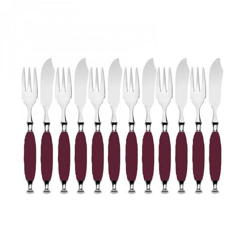 O jogo de garfo e faca para peixe da Linha Country da Bugatti apresenta cabo em acrílico com efeito madrepérola suavemente arredondado e aro cônico em aço polido.