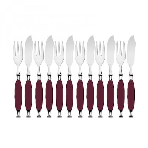 O jogo de garfo e faca para peixe da Linha Country da Bugatti apresenta cabo em acrílico com efeito madrepérola suavemente arredondado e aro cônico em aço polido.