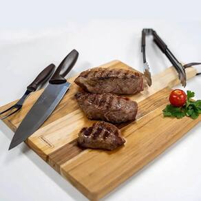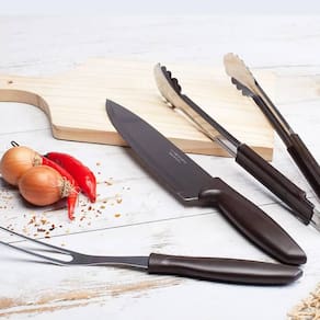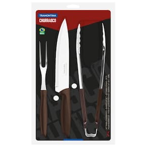 Conteúdo: 1 garfo trinchante, 1 faca chef 8'' e 1 pegador.