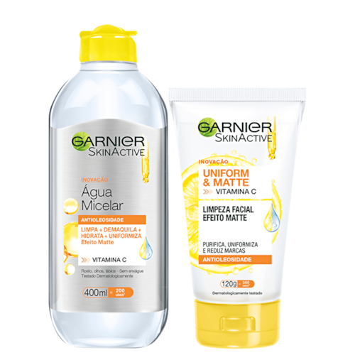 Perfeito para peles oleosas, o Kit Garnier SkinActive Uniform & Matte Vitamina C apresenta fórmula rica em antioxidantes. Em conjunto, os ingredientes têm o poder de prover uma pele limpa, hidratada, uniforme e com efeito matte logo após a primeira aplicação.