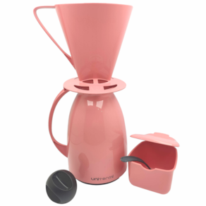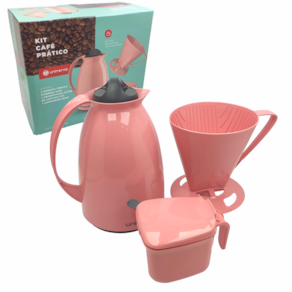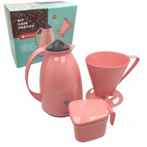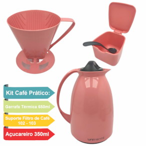 Kit de Café Prático, com um encaixe perfeito para facilitar ainda mais o seu dia a dia, que vem acompanhado de uma garrafa térmica, um suporte de filtro e um açucareiro.