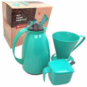 Kit de Café Prático, com um encaixe perfeito para facilitar ainda mais o seu dia a dia, que vem acompanhado de uma garrafa térmica, um suporte de filtro e um açucareiro.