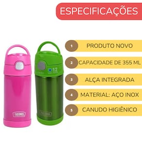 FICHA TÉCNICA: Capacidade: 355 ml Material: Aço inoxidável de parede dupla Isolamento a vácuo: Mantém as bebidas frias por até 12 horas Alça de transporte integrada Canudo de silicone higiênico modificado NÃO ADEQUADO para líquidos quentes