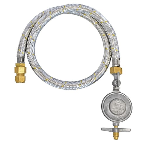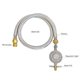 Especificações Técnicas Mangueira flexível: Revestida em aço inox 304 com borracha de alta resistência, conforme norma NBR 14955.Pressão máxima de trabalho: 7 bar.Temperatura máxima de operação: 120°C.Dimensões da mangueira: 3/8” (I) x 2000 mm.Adaptador de aperto rápido: Para instalação prática e segura.Regulador de gás: Vazão de 1 kg/h (modelo Aliança 503/10), garantindo um fluxo estável e eficiente.Comprimento da mangueira: 200 cm.Diâmetro da mangueira: 1,6 cm. BenefíciosDurabilidade Superior