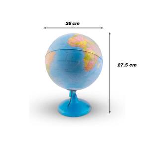 Características Globo geográfico luminoso, dupla cartografia: físico quando está apagado e com desenho de planetário quando está aceso Base e meridiano em plástico de alta resistência. O Globo Geográfico possue o diâmetro: 25 cm e é feito com Poliestireno, um material atóxico, mais rigido e resistente.