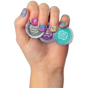 Contém: 6 Potes de Glitter ( cor sortida ), 1 Mini Escova de Glitter, 1 Folha de adesivos de unha, conjunto de adesivos de dupla face e 1 Guia de Instruções.