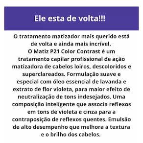Neutralização de Tons Amarelados: Matiza eficazmente, neutralizando os indesejados tons amarelados. Brilho Intenso: Realça a cor dos fios, deixando um brilho radiante. Hidratação Profunda: Fórmula enriquecida que hidrata e nutre profundamente os cabelos. Proteção da Cor: Ajuda a preservar a cor dos cabelos por mais tempo. Ação Antioxidante: Protege contra os danos causados pelos radicais livres. Características: