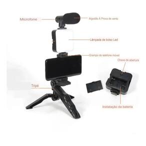 1x Kit de Gravação [4 em 1]1x Tripé1x LED 6500K1x Suporte Universal de Celular1x Microfone1x Cabo de Conexão P2 P23x Pilhas AAA