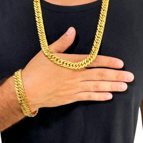 Kit Grumet 13mm Corrente + Pulseira Banhado a Ouro 18K Detalhes do Produto: Material: ligas metálicas de alta qualidade, especialmente tratadas para fixação e absorção do ouro, com acabamento em verniz protetor. Aparência: visual idêntico ao ouro maciço. Produção: artesanal, com atenção meticulosa aos detalhes. Banho: 10 camadas espessas de ouro 18k, finalizadas com verniz antialérgico . Elos: soldados varia conforme o modelo . Pedras: zircônias brilhantes cravejadas quando aplicável . Tamanhos Disponíveis: Cordões Masculinos: 70cm padrão e 60cm sob consulta/Pedido Via Chat . Cordões Femininos: 50cm padrão e 45cm sob consulta/Pedido Via Chat . Pulseiras: 21cm padrão ; tamanhos de 18cm a 23cm sob consulta/Pedido Via Chat. Pingentes: conforme imagens; consulte para mais detalhes via chat. Espessuras Recomendadas para Cordões / Pingentes: P: 1mm a 4mm M: 4mm a 8mm G: 6mm a 13mm Gg: 12mm a 18mm Incluso na Compra: Saquinho de organza para armazenamento seguro. Caixa elegante, perfeita para presente. Cupom de desconto para a próxima compra. Flyer com outros produtos da coleção. Carta de agradecimento personalizada. Adesivo da marca ToJoia18k. Informações Adicionais: : 6 meses termos acompanham o produto . Devolução: 7 dias para devolução sem questionamentos. Envio: despacho em até 24 horas úteis após confirmação do pagamento. Cuidados com a Peça: Evite contato com produtos químicos; aguarde o perfume secar antes de usar. Evite contato com shampoo, condicionadores e suor excessivo. Armazene em local seco, preferencialmente no saquinho de organza fornecido. Uso no mar e piscina é permitido; lave com água corrente e sabão neutro após. Por que Escolher a ToJoia18k Semi-joias luxuosas que combinam estilo, qualidade e sofisticação. Banho espesso de ouro 18k, garantindo brilho duradouro e acabamento impecável. Design exclusivo e produção artesanal, perfeitos para qualquer ocasião. Materiais premium que asseguram durabilidade. Ao escolher uma semi-joia ToJoia18k, você investe em qualidade, elegância e uma experiência única. Aguardamos sua compra Observação: pode ocorrer variação no fecho raramente . Imagens reais, sem edição. Qualquer dúvida, estamos à disposição para esclarecimentos. Marca: Não Informado