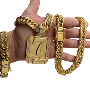 Kit Grumet 14mm + Pingente 7 Banhado a Ouro Detalhes do Produto: Material: ligas metálicas de alta qualidade, especialmente tratadas para fixação e absorção do ouro, com acabamento em verniz protetor. Aparência: visual idêntico ao ouro maciço. Produção: artesanal, com atenção meticulosa aos detalhes. Banho: 10 camadas espessas de ouro 18k, finalizadas com verniz antialérgico . Elos: soldados varia conforme o modelo . Pedras: zircônias brilhantes cravejadas quando aplicável . Tamanhos Disponíveis: Cordões Masculinos: 70cm padrão e 60cm sob consulta/Pedido Via Chat . Cordões Femininos: 50cm padrão e 45cm sob consulta/Pedido Via Chat . Pulseiras: 21cm padrão ; tamanhos de 18cm a 23cm sob consulta/Pedido Via Chat. Pingentes: conforme imagens; consulte para mais detalhes via chat. Espessuras Recomendadas para Cordões / Pingentes: P: 1mm a 4mm M: 4mm a 8mm G: 6mm a 13mm Gg: 12mm a 18mm Incluso na Compra: Saquinho de organza para armazenamento seguro. Caixa elegante, perfeita para presente. Cupom de desconto para a próxima compra. Flyer com outros produtos da coleção. Carta de agradecimento personalizada. Adesivo da marca ToJoia18k. Informações Adicionais: : 6 meses termos acompanham o produto . Devolução: 7 dias para devolução sem questionamentos. Envio: despacho em até 24 horas úteis após confirmação do pagamento. Cuidados com a Peça: Evite contato com produtos químicos; aguarde o perfume secar antes de usar. Evite contato com shampoo, condicionadores e suor excessivo. Armazene em local seco, preferencialmente no saquinho de organza fornecido. Uso no mar e piscina é permitido; lave com água corrente e sabão neutro após. Por que Escolher a ToJoia18k Semi-joias luxuosas que combinam estilo, qualidade e sofisticação. Banho espesso de ouro 18k, garantindo brilho duradouro e acabamento impecável. Design exclusivo e produção artesanal, perfeitos para qualquer ocasião. Materiais premium que asseguram durabilidade. Ao escolher uma semi-joia ToJoia18k, você investe em qualidade, elegância e uma experiência única. Aguardamos sua compra Observação: pode ocorrer variação no fecho raramente . Imagens reais, sem edição. Qualquer dúvida, estamos à disposição para esclarecimentos. Marca: Não Informado