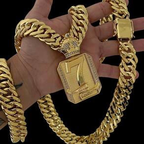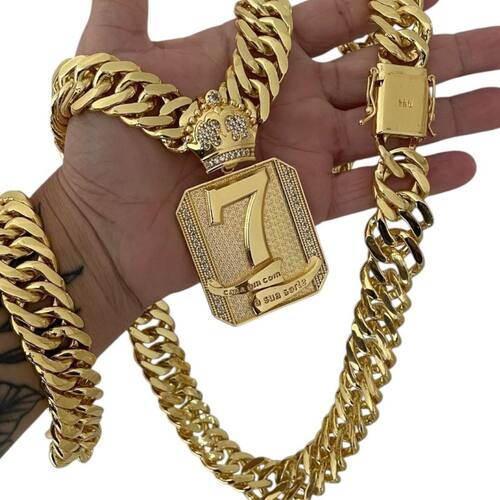 Kit Grumet 15mm + Pingente 7 Cada Um Com a Sua Sorte Ouro Detalhes do Produto: Material: ligas metálicas de alta qualidade, especialmente tratadas para fixação e absorção do ouro, com acabamento em verniz protetor. Aparência: visual idêntico ao ouro maciço. Produção: artesanal, com atenção meticulosa aos detalhes. Banho: 10 camadas espessas de ouro 18k, finalizadas com verniz antialérgico . Elos: soldados varia conforme o modelo . Pedras: zircônias brilhantes cravejadas quando aplicável . Tamanhos Disponíveis: Cordões Masculinos: 70cm padrão e 60cm sob consulta/Pedido Via Chat . Cordões Femininos: 50cm padrão e 45cm sob consulta/Pedido Via Chat . Pulseiras: 21cm padrão ; tamanhos de 18cm a 23cm sob consulta/Pedido Via Chat. Pingentes: conforme imagens; consulte para mais detalhes via chat. Espessuras Recomendadas para Cordões / Pingentes: P: 1mm a 4mm M: 4mm a 8mm G: 6mm a 13mm Gg: 12mm a 18mm Incluso na Compra: Saquinho de organza para armazenamento seguro. Caixa elegante, perfeita para presente. Cupom de desconto para a próxima compra. Flyer com outros produtos da coleção. Carta de agradecimento personalizada. Adesivo da marca ToJoia18k. Informações Adicionais: : 6 meses termos acompanham o produto . Devolução: 7 dias para devolução sem questionamentos. Envio: despacho em até 24 horas úteis após confirmação do pagamento. Cuidados com a Peça: Evite contato com produtos químicos; aguarde o perfume secar antes de usar. Evite contato com shampoo, condicionadores e suor excessivo. Armazene em local seco, preferencialmente no saquinho de organza fornecido. Uso no mar e piscina é permitido; lave com água corrente e sabão neutro após. Por que Escolher a ToJoia18k Semi-joias luxuosas que combinam estilo, qualidade e sofisticação. Banho espesso de ouro 18k, garantindo brilho duradouro e acabamento impecável. Design exclusivo e produção artesanal, perfeitos para qualquer ocasião. Materiais premium que asseguram durabilidade. Ao escolher uma semi-joia ToJoia18k, você investe em qualidade, elegância e uma experiência única. Aguardamos sua compra Observação: pode ocorrer variação no fecho raramente . Imagens reais, sem edição. Qualquer dúvida, estamos à disposição para esclarecimentos. Marca: Não Informado