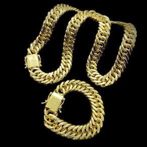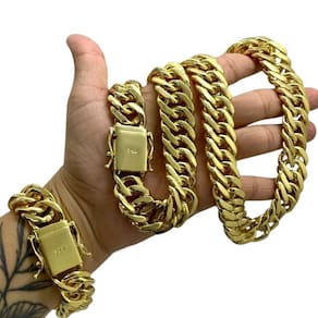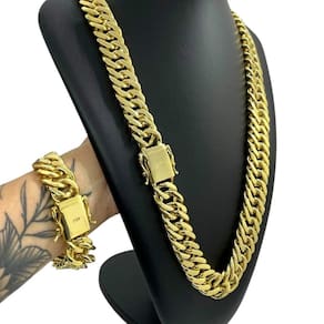 Kit Grumet 20mm Fecho 750 Banhado a Ouro 18K Detalhes do Produto: Material: ligas metálicas de alta qualidade, especialmente tratadas para fixação e absorção do ouro, com acabamento em verniz protetor. Aparência: visual idêntico ao ouro maciço. Produção: artesanal, com atenção meticulosa aos detalhes. Banho: 10 camadas espessas de ouro 18k, finalizadas com verniz antialérgico . Elos: soldados varia conforme o modelo . Pedras: zircônias brilhantes cravejadas quando aplicável . Tamanhos Disponíveis: Cordões Masculinos: 70cm padrão e 60cm sob consulta/Pedido Via Chat . Cordões Femininos: 50cm padrão e 45cm sob consulta/Pedido Via Chat . Pulseiras: 21cm padrão ; tamanhos de 18cm a 23cm sob consulta/Pedido Via Chat. Pingentes: conforme imagens; consulte para mais detalhes via chat. Espessuras Recomendadas para Cordões / Pingentes: P: 1mm a 4mm M: 4mm a 8mm G: 6mm a 13mm Gg: 12mm a 18mm Incluso na Compra: Saquinho de organza para armazenamento seguro. Caixa elegante, perfeita para presente. Cupom de desconto para a próxima compra. Flyer com outros produtos da coleção. Carta de agradecimento personalizada. Adesivo da marca ToJoia18k. Informações Adicionais: : 6 meses termos acompanham o produto . Devolução: 7 dias para devolução sem questionamentos. Envio: despacho em até 24 horas úteis após confirmação do pagamento. Cuidados com a Peça: Evite contato com produtos químicos; aguarde o perfume secar antes de usar. Evite contato com shampoo, condicionadores e suor excessivo. Armazene em local seco, preferencialmente no saquinho de organza fornecido. Uso no mar e piscina é permitido; lave com água corrente e sabão neutro após. Por que Escolher a ToJoia18k Semi-joias luxuosas que combinam estilo, qualidade e sofisticação. Banho espesso de ouro 18k, garantindo brilho duradouro e acabamento impecável. Design exclusivo e produção artesanal, perfeitos para qualquer ocasião. Materiais premium que asseguram durabilidade. Ao escolher uma semi-joia ToJoia18k, você investe em qualidade, elegância e uma experiência única. Aguardamos sua compra Observação: pode ocorrer variação no fecho raramente . Imagens reais, sem edição. Qualquer dúvida, estamos à disposição para esclarecimentos. Marca: Não Informado