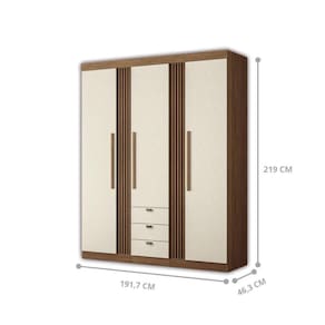 A comoda possui portas, gavetas e cabideiro, garantindo um amplo espaço para armazenar desde sapatos e roupas a todos os tipos de itens.