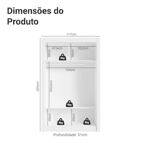 Conta com diversos nichos internos que facilitam a organização de roupas, calçados e acessórios. O tubo cabideiro metálico é ideal para pendurar roupas longas.