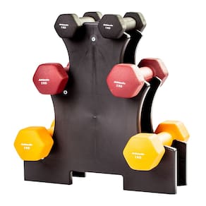 Itens da Caixa: 1 par de halteres de 1kg, 1 par de halteres de 2kg, 1 par de halteres de 3kg e 1 suporte