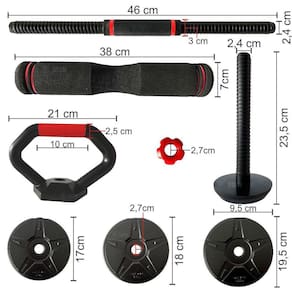 O kit multifuncional 6 em 1 Odin Fit é um kit versátil que te possibilita um treino completo com inúmeros exercícios. O kit te proporciona várias formas de montagens como: Kettlebell, Par de Halteres, Halter com pegada externa, Apoio fixo para flexão, barra 97cm e barra 110cm sendo todos estes com peso ajustável.Um único kit te permite ter os principais equipamentos para um treino de pernas, braços, costas, bíceps, tríceps e demais grupos musculares que podem ser trabalhados com um treino de pesos livres.A possibilidade de ajuste de carga te permitirá alterar os níveis de exercícios a serem realizados com esse kit. O kit Odin Fit acompanha 20kg em anilhas podendo ser montado da forma que desejar, com todas as anilhas, ou com a quantidade de peso que desejar, podendo também ser utilizado sem carga apenas o peso das barras . Acompanha 4 anilhas de 1,25kg, 4 anilhas de 1,5kg e 4 anilhas de 2kg, permitindo uma infinidade de combinações de pesos, se adequando à sua necessidade.O kit multifuncional de barras e kettlebell Odin Fit possui 22 itens te permitindo uma infinidade de montagens para realizar o seu treino em casa ou onde quiser.Composição do kit:4 anilhas com revestimento em ABS de 1,25kg;4 anilhas com revestimento em ABS de 1,5kg;4 anilhas com revestimento em ABS de 2kg;2 barras rosqueáveis 46cm;1 barra rosqueável revestida em EVA 38cm;1 base para montagem de kettlebell;2 puxadores para kettlebell que servem como apoio fixo para flexão ;4 presilhas de rosca para as barras;Especificações:Diâmetro da barra central revestida por EVA: 7cm;Comprimento da barra revestida por EVA: 38cm;Material da barra halter: Tubo de aço de alta densidade, revestido em ABS de alta resistência;Comprimento da barra halter: 46cm;Diâmetro da barra halter: 2,4cm na área de suporte das anilhas e 3cm no centro pegada ;Diâmetro da circunferência interna das anilhas: 2,7cm;Composição das anilhas: Pó de ferro + cimento, revestido em ABS de alta resistênciaRevestimento das anilhas: ABS de alta resistência;Material das presilhas rosqueáveis: ABS;Altura da base para montagem do Kettlebell: 13,7cm;Diâmetro do apoio da base para montagem de kettlebell: 9,9cm;Diâmetro da pegada do puxador do kettlebell/apoio fixo: 2,5cm;Peso ajustável Sim;Possibilidades de montagem: Kettlebell, Par de Halteres, Halter com pegada externa, Apoio fixo para flexão, barra 97cm e barra 110cm variável conforme montagem .Peso máximo na montagem do kettlebell: 9,25kg;Peso mínimo na montagem do kettlebell: 530g sem anilhas, só a base + puxador ;Peso máximo possível na montagem de 1 halter: 14 kg;Peso mínimo na montagem de 1 halter: 330g só a barra sem anilhas ;Peso máximo na montagem da barra completa: 20kg;Peso mínimo na montagem da barra 97cm: 1,125 kg só a barra sem anilhas ;Peso de suporte máximo recomendado: 20kgNão é recomendado utilizar anilhas extras que não acompanhem o kit.Obs: Produto não acompanha maleta.Alguns exemplos de exercícios que podem ser realizados com o kit musculação multifuncional Odin Fit:Kettlebell: stiff, agachamentos, afundos, remada curvada, desenvolvimento, abdominal twist, swings, get ups, remadas, halo, pullover, entre outros.Par de halteres: supino, elevações, extensão de tríceps, trações, flexões de braço, remada, rosca direta/martelo, desenvolvimento, avanço, stiff, crucifixo, entre outros.Halter com pegada externa: remada aberta curvada, rosca martelo, pullover, entre outros.Apoio Fixo para Flexão: Flexão de braços, prancha alta pegada neutra;Barra reta 97cm: Levantamento terra, agachamento, avanço, supino, rosca direta, desenvolvimento, pullover, elevações, remadas, entre outros.Barra reta 110cm variável conforme montagem : Levantamento terra, agachamento, avanço, supino, rosca direta, desenvolvimento, pullover, elevações, remadas, entre outros.Garantia de 3 meses contra defeitos de fabricação.