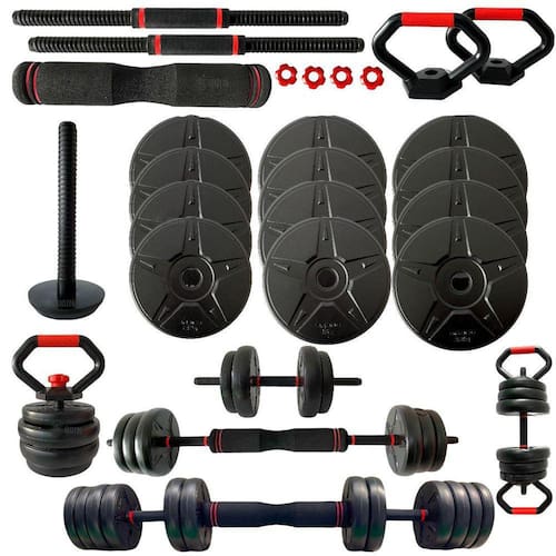 O kit multifuncional 6 em 1 Odin Fit é um kit versátil que te possibilita um treino completo com inúmeros exercícios. O kit te proporciona várias formas de montagens como: Kettlebell, Par de Halteres, Halter com pegada externa, Apoio fixo para flexão, barra 97cm e barra 110cm sendo todos estes com peso ajustável.Um único kit te permite ter os principais equipamentos para um treino de pernas, braços, costas, bíceps, tríceps e demais grupos musculares que podem ser trabalhados com um treino de pesos livres.A possibilidade de ajuste de carga te permitirá alterar os níveis de exercícios a serem realizados com esse kit. O kit Odin Fit acompanha 20kg em anilhas podendo ser montado da forma que desejar, com todas as anilhas, ou com a quantidade de peso que desejar, podendo também ser utilizado sem carga apenas o peso das barras . Acompanha 4 anilhas de 1,25kg, 4 anilhas de 1,5kg e 4 anilhas de 2kg, permitindo uma infinidade de combinações de pesos, se adequando à sua necessidade.O kit multifuncional de barras e kettlebell Odin Fit possui 22 itens te permitindo uma infinidade de montagens para realizar o seu treino em casa ou onde quiser.Composição do kit:4 anilhas com revestimento em ABS de 1,25kg;4 anilhas com revestimento em ABS de 1,5kg;4 anilhas com revestimento em ABS de 2kg;2 barras rosqueáveis 46cm;1 barra rosqueável revestida em EVA 38cm;1 base para montagem de kettlebell;2 puxadores para kettlebell que servem como apoio fixo para flexão ;4 presilhas de rosca para as barras;Especificações:Diâmetro da barra central revestida por EVA: 7cm;Comprimento da barra revestida por EVA: 38cm;Material da barra halter: Tubo de aço de alta densidade, revestido em ABS de alta resistência;Comprimento da barra halter: 46cm;Diâmetro da barra halter: 2,4cm na área de suporte das anilhas e 3cm no centro pegada ;Diâmetro da circunferência interna das anilhas: 2,7cm;Composição das anilhas: Pó de ferro + cimento, revestido em ABS de alta resistênciaRevestimento das anilhas: ABS de alta resistência;Material das presilhas rosqueáveis: ABS;Altura da base para montagem do Kettlebell: 13,7cm;Diâmetro do apoio da base para montagem de kettlebell: 9,9cm;Diâmetro da pegada do puxador do kettlebell/apoio fixo: 2,5cm;Peso ajustável Sim;Possibilidades de montagem: Kettlebell, Par de Halteres, Halter com pegada externa, Apoio fixo para flexão, barra 97cm e barra 110cm variável conforme montagem .Peso máximo na montagem do kettlebell: 9,25kg;Peso mínimo na montagem do kettlebell: 530g sem anilhas, só a base + puxador ;Peso máximo possível na montagem de 1 halter: 14 kg;Peso mínimo na montagem de 1 halter: 330g só a barra sem anilhas ;Peso máximo na montagem da barra completa: 20kg;Peso mínimo na montagem da barra 97cm: 1,125 kg só a barra sem anilhas ;Peso de suporte máximo recomendado: 20kgNão é recomendado utilizar anilhas extras que não acompanhem o kit.Obs: Produto não acompanha maleta.Alguns exemplos de exercícios que podem ser realizados com o kit musculação multifuncional Odin Fit:Kettlebell: stiff, agachamentos, afundos, remada curvada, desenvolvimento, abdominal twist, swings, get ups, remadas, halo, pullover, entre outros.Par de halteres: supino, elevações, extensão de tríceps, trações, flexões de braço, remada, rosca direta/martelo, desenvolvimento, avanço, stiff, crucifixo, entre outros.Halter com pegada externa: remada aberta curvada, rosca martelo, pullover, entre outros.Apoio Fixo para Flexão: Flexão de braços, prancha alta pegada neutra;Barra reta 97cm: Levantamento terra, agachamento, avanço, supino, rosca direta, desenvolvimento, pullover, elevações, remadas, entre outros.Barra reta 110cm variável conforme montagem : Levantamento terra, agachamento, avanço, supino, rosca direta, desenvolvimento, pullover, elevações, remadas, entre outros.Garantia de 3 meses contra defeitos de fabricação.