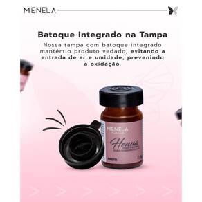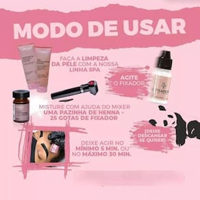 Henna para Sobrancelhas Menela A Henna Menela é a número 1 entre as designers de sobrancelhas por uma razão: resultado impecável com tecnologia de ponta. Desenvolvida com nanotecnologia, ela pigmenta as camadas mais profundas da pele e dos pelos - até mesmo os brancos - com fixação e intensidade, garantindo um design marcante e duradouro. É referência em performance, rendimento e segurança para quem exige o melhor. Benefícios e características da Henna Menela: Alta pigmentação desde o primeiro minuto Cobre até pelos brancos com intensidade Rendimento superior: até 60 aplicações por pote Duração de até 15 dias na pele Brilho natural e realce do desenho Aplicação rápida: de 1 a 20 minutos Praticidade com batoque integrado Cores reais e versáteis: 5 tonalidades Fácil preparo e Dermatologicamente testada e aprovada pela ANVISA Não contém Cinza, amônia, parabenos, peróxido de hidrogênio, iodo nem metais pesados Produto Cruelty Free Fixador com Extrato de Bambu - benefícios exclusivos: Fortalece os fios com sílica natural Estimula o crescimento das sobrancelhas Hidrata e proporciona brilho natural Protege e regenera a pele da região Potencializa a fixação da henna na pele Textura leve e sensação refrescante Prolonga a durabilidade da coloração O que vem no Kit Henna Menela: 1 Henna Menela 2,5g com batoque integrado 1 Fixador com Extrato de Bambu 15ml 1 Pá dosadora/medidora Modo de Preparo e Aplicação: Higienize as sobrancelhas, removendo oleosidade e impurezas. Agite bem o fixador antes de usar. Misture 1 pá de henna com 15 a 25 gotas do fixador até obter a consistência ideal uso de mixer é recomendado . Aplique com pincel apropriado e deixe agir de 1 a 20 minutos. Remova com algodão umedecido em água mineral. Marca: Não Informado