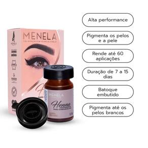 Henna para Sobrancelhas Menela Desenvolvida com nanotecnologia, ela pigmenta as camadas mais profundas da pele e dos pelos - até mesmo os brancos - com fixação e intensidade, garantindo um design marcante e duradouro. É referência em performance, rendimento e segurança para quem exige o melhor. Benefícios e características da Henna Menela: Alta pigmentação desde o primeiro minuto Cobre até pelos brancos com intensidade Rendimento superior: até 60 aplicações por pote Duração de até 15 dias na pele Brilho natural e realce do desenho Aplicação rápida: de 1 a 20 minutos Praticidade com batoque integrado Fácil preparo e Dermatologicamente testada e aprovada pela ANVISA Não contém Cinza, amônia, parabenos, peróxido de hidrogênio, iodo nem metais pesados Produto Cruelty Free Tecnologia Avançada com Nanotecnologia: profunda na pele e nos fios Fixação superior, com mais definição e intensidade Liberação inteligente de ativos durante o uso Menor risco de irritação, ideal para peles sensíveis Nutrição dos fios: crescimento fortalecido Textura cremosa para aplicação precisa Resultados mais rápidos e visíveis Fixador com Extrato de Bambu - benefícios exclusivos: Fortalece os fios com sílica natural Estimula o crescimento das sobrancelhas Hidrata e proporciona brilho natural Protege e regenera a pele da região Potencializa a fixação da henna na pele Textura leve e sensação refrescante Prolonga a durabilidade da coloração O que vem no Kit Henna Menela: 1 Henna Menela 2,5g com batoque integrado 1 Fixador com Extrato de Bambu 15ml 1 Pá dosadora/medidora Modo de Preparo e Aplicação: Higienize as sobrancelhas, removendo oleosidade e impurezas. Agite bem o fixador antes de usar. Misture 1 pá de henna com 15 a 25 gotas do fixador até obter a consistência ideal uso de mixer é recomendado . Aplique com pincel apropriado e deixe agir de 1 a 20 minutos. Remova com algodão umedecido em água mineral.