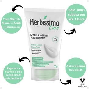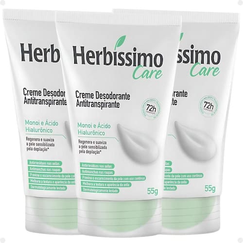- 03 Cremes Desodorantes Antitranspirante Herbissimo Care Monoi e Ácido Hialurônico 55g.