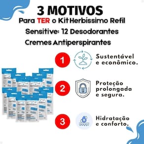 Perfeito para o uso diário, o Kit Herbíssimo Refil Sensitive é a escolha ideal para quem busca proteção duradoura e cuidado especial para as axilas, seja na rotina de trabalho, atividades físicas ou momentos de lazer. Sua fórmula suave é especialmente indicada para pessoas com peles sensíveis que necessitam de hidratação e proteção contínua. Ideal para usar após a depilação, em viagens ou em qualquer situação que exija proteção extra e conforto.