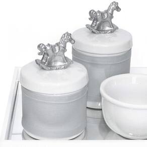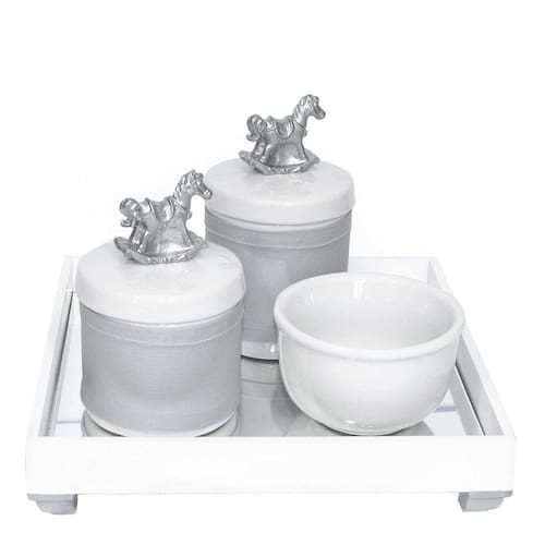 Aposte nesse kit higiene que foi desenvolvido para facilitar a vida das mamães e papais na hora de higienizar o bebê Produzido com materiais de alta qualidade, o kit conta com bandeja espelhada e porcelana de qualidade. Além disso, é um lindo item decorativo que irá encantar a todos Dados TécnicosKit higiene com bandeja em MDF com pintura branca com detalhe prata, fundo de espelho e decoração com resinas de Cavalinho prata nas tampas dos potes com capas Itens Inclusos no Kit01 Bandeja com espelho01 Pote grande em porcelana branca com tampa01 Pote pequeno em porcelana branca com tampa01 Molhadeira em porcelana branca01 Conjunto de 2 capas em tecido e tiras aderentes para pote grande e pote pequeno MedidasBandeja: 25 cm de largura, 25 cm de comprimento e 4,5 cm de alturaPote Grande: 9 cm de diâmetro e 10 cm alturaPote Pequeno: 9 cm de diâmetro e 8,5 cm alturaMolhadeira: 10,5 cm de diâmetro e 6,5 cm de altura