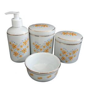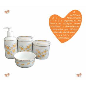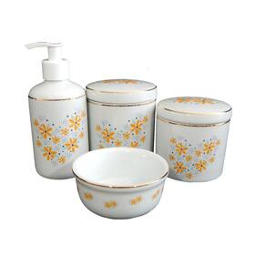 É composto por: -1 Molhadeira em porcelana na cor branca, tamanho 5,0cm de altura x 9,0cm de diâmetro. -1 Pote Médio de porcelana na cor branca com tampa em porcelana, tamanho 8,5cm de altura x 9,0cm de diâmetro. -1 Pote Grande de porcelana na cor branca com tampa em porcelana, tamanho 10cm de altura x 9,0cm de diâmetro. -1 Porta álcool em gel/sabonete líquido na cor branca, tamanho 15,5cm de altura x 6,5cm de diâmetro.