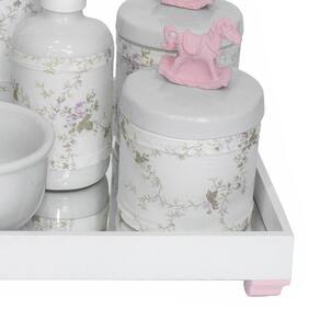 Aposte nesse kit higiene que foi desenvolvido para facilitar a vida das mamães e papais na hora de higienizar o bebê Produzido com materiais de alta qualidade, o kit conta com bandeja espelhada e porcelana de qualidade. Além disso, é um lindo item decorativo que irá encantar a todos Dados TécnicosKit higiene com bandeja de MDF em pintura branca com detalhe rosa, fundo de espelho e decoração com resinas de Cavalinho rosa nas tampas dos potes com capas Itens Inclusos no Kit01 Bandeja com espelho01 Garrafa Térmica - Marca Termolar - 250 ml01 Pote grande em porcelana branca com tampa01 Pote pequeno em porcelana branca com tampa01 Molhadeira em porcelana branca01 Porta Álcool-Gel/ Sabonete Líquido em porcelana branca01 Conjunto de 4 capas em tecido e tiras aderentes para garrafa térmica, pote grande, pote pequeno e porta álcool-gel MedidasBandeja: 25 cm de largura, 25 cm de comprimento e 4,5 cm de alturaGarrafa Térmica: 7,5 cm de diâmetro e 18 cm de alturaPote Grande: 9 cm de diâmetro e 10 cm alturaPote Pequeno: 9 cm de diâmetro e 8,5 cm alturaMolhadeira: 10,5 cm de diâmetro e 6,5 cm de alturaPorta Álcool-Gel/Sabonete Liquido: 6,5 cm de diâmetro e 15 cm de altura