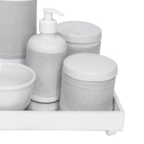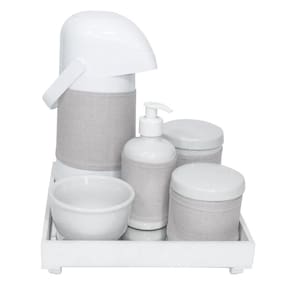 Aposte nesse kit higiene que foi desenvolvido para facilitar a vida das mamães e papais na hora de higienizar o bebê Produzido com materiais de alta qualidade, o kit conta com bandeja espelhada e porcelana de qualidade. Além disso, é um lindo item decorativo que irá encantar a todos Dados TécnicosKit higiene com bandeja em MDF com pintura branca e fundo de espelho Itens Inclusos no Kit01 Bandeja com espelho01 Garrafa Térmica - Marca Termolar - modelo Magic Pump - 500 ml01 Pote grande em porcelana branca com tampa01 Pote pequeno em porcelana branca com tampa01 Molhadeira em porcelana branca01 Porta Álcool-Gel/ Sabonete Líquido em porcelana branca01 Conjunto de 4 capas em tecido e tiras aderentes para garrafa térmica, pote grande, pote pequeno e porta álcool-gel MedidasBandeja: 25 cm de largura, 25 cm de comprimento e 4,5 cm de alturaGarrafa Térmica: 11 cm de diâmetro e 25 cm de alturaPote Grande: 9 cm de diâmetro e 10 cm alturaPote Pequeno: 9 cm de diâmetro e 8,5 cm alturaMolhadeira: 10,5 cm de diâmetro e 6,5 cm de alturaPorta Álcool-Gel/Sabonete Liquido: 6,5 cm de diâmetro e 15 cm de altura