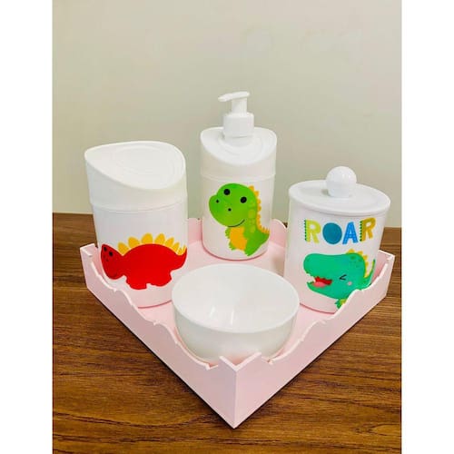 Kit Organizador para bebê c/bandeja Cor dos Potes: BRANCO PADRÃO MATERIAL DOS POTES: ACRÍLICO MATERIAL DA BANDEJA: MDF Kit acompanha: - 1 bandeja de madeira em MDF - 1 porta sabonete / álcool gel - 1 molheira - 1 porta algodão - 1 porta cotonete MEDIDAS DA BANDEJA EM MDF: Diâmetro: 20x20cm MEDIDA DOS POTES: Porta algodão/cotonete: 8x10,5 cm Porta sabonete líquido: 12x21 cm Molheira: 8x5 cm Ean: 7898901266372