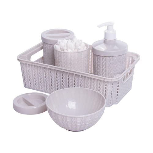 preparado para as ocasioes do dia a dia, este lindo kit vem com 5 itens que vão facilitar na hora da higienização do seu bebê. Ele conta com 1 porta sabonete liquido, que pode ser utilizado também para cremes e etc, 2 porta algodões com tampa que pode ser utilizados para guardar cotonetes, lenços umidecidos,1 molhadeira para colocar água e facilitar a limpeza e uma cestinha para colocar o que mais for necessario, como pomadas, outros produtos de higiene e etc