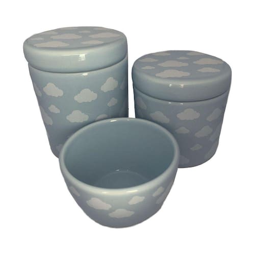O kit higiene nuvem pastel é simplesmente muito meigo. Confeccionado em porcelana azul pastel com nuvens brancas, traz delicadeza na decoração e é ideal para auxiliar a mamãe na troca do bebê. Ele é composto por 3 peças, sendo um bowl, um pote maior e um menor. Com certeza deixará o cantinho da higiene do seu pequeno ou da sua pequena uma fofura só.