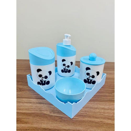 Kit Organizador para bebê c/bandeja em MDF. Cor do Pote: BRANCO PADRÃO Tampas: AZUL MATERIAL DOS POTES: ACRÍLICO MATERIAL DA BANDEJA: MDF Kit acompanha: - 1 bandeja de madeira em MDF. - 1 porta sabonete / álcool gel - 1 molheira - 1 porta algodão - 1 porta cotonete MEDIDAS DA BANDEJA EM MDF: Diâmetro: 19,5x19 cm Altura: 5x8cm MEDIDA DOS POTES: Porta algodão/cotonete: 8x10,5 cm Porta sabonete líquido: 12x21 cm Molheira: 8x5 cm Marca: Doya Kids