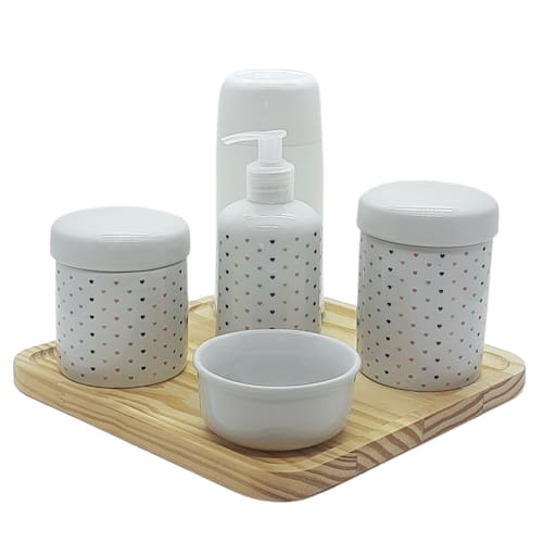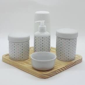 Kit higiene bebê Poá 6 pçs - Porcelana e Bdj Pinus- Molhadeira Branca Peças muito resistentes, feitas com esmalte queimado em alta temperatura. Peças para armazenamento de cotonetes, algodão, água, etc. Os decalque são aplicados e queimados junto à peça, o que os funde a peça, dão brilho e não desbotam com o tempo. Dimensões (AxL): Pote Maior 9cm x 8,5cm, capacidade de 400 ml. Pote Menor 7cm x 9cm, capacidade de 250 ml. Porta sabonete Liquido/álcool gel: capacidade 300ml Molhadeira Branca: 120ml Garrafa térmica: 250ml Bandeja de pinus (CxLxA): 25cm x 25cm x 1,7cm OBS: Por se tratar de madeira de pinus natural, pode existir pequenas variações na tonalidade das cores da madeira. A tampa é apenas colocada por cima, sendo assim não oferece nenhuma trava de vedação. As peças podem sofrer pequenas alterações de tonalidade devido a diferentes lotes de queima Embalagem contem 6 peças Marca: Antilope Decor Porcelanas